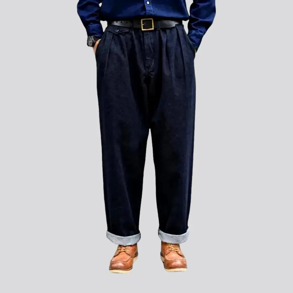 Crafted with a passion for contemporary style. these jeans embody the essence of urbane fashion with a bold and baggy cut. The pleated rise and high-waist design add a touch of edginess. while the dark-wash finish exudes a cool and effortless style.