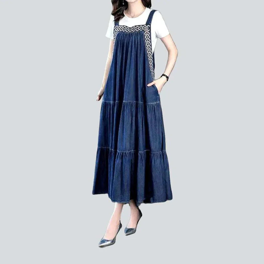 Discover the allure of our exquisite embroidered denim jeans dress. where classic street style meets modern elegance.