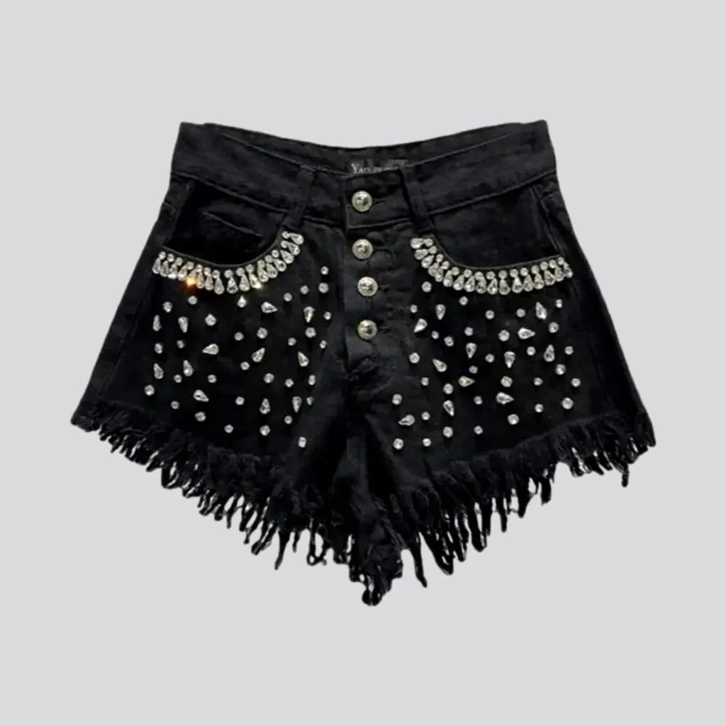 Crafted with precision and attention to detail. these shorts perfectly embody the New-millennium aesthetic while also incorporating trendy touches that make them a must-have for any couture-forward individual. The straight fit and embellished rhinestone pattern add a touch of glamour and sophistication. while the frayed-hem and button closure give them a playful and street vibe.