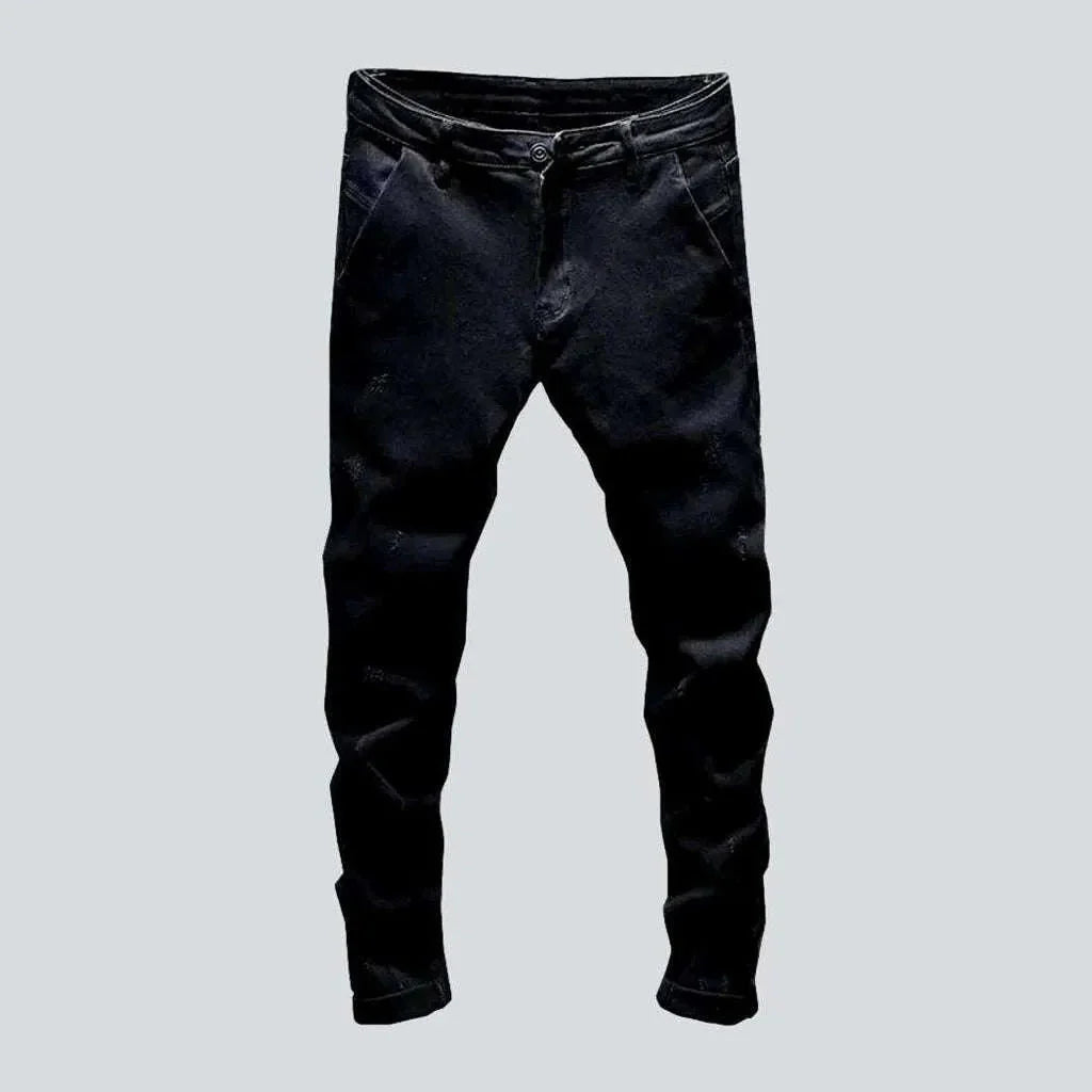 Give your wardrobe a modern. monochromatic makeover with our Autumn Collection of Black Tight Stretchy Men's Jeans. Boasting a mid-rise design with zipper and button closure. these casual jeans are perfect for the fashion-forward man who wants to stay stylishly ahead of the curve.
