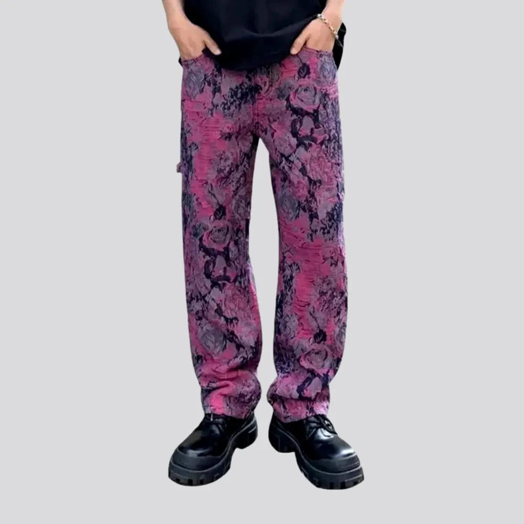 Elevate your trend game with these boho. baggy cut jeans from the Summer Collection. Crafted with a mid-waist. these jeans feature a zipper and button closure for added convenience. The standout feature of these jeans is the vibrant color-ornament design. giving them a unique and eye-catching appeal. These jeans are perfect for the fashion-forward man who wants to make a statement.
