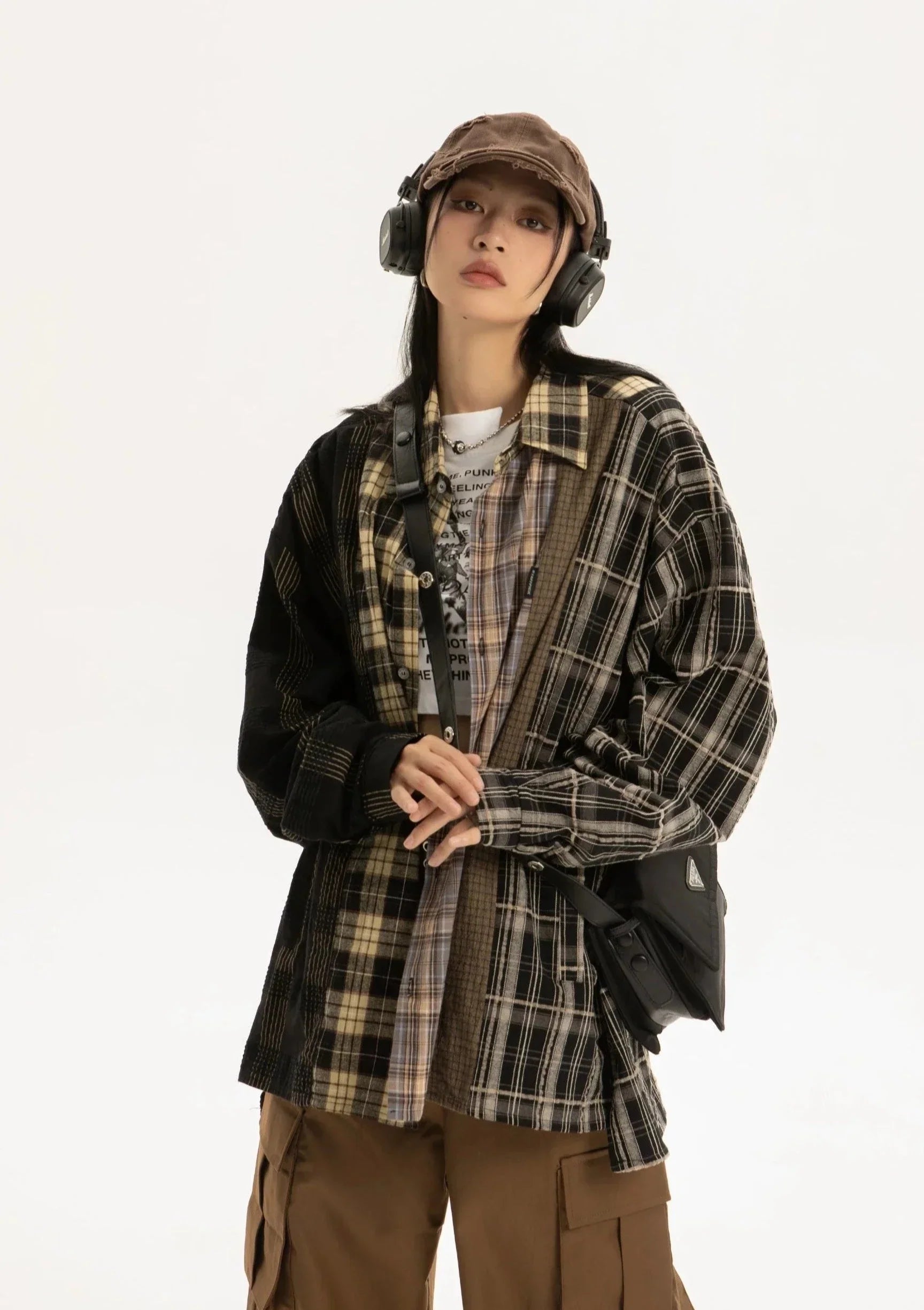 Spliced patchwork of faded plaid prints. spread collar. button closure. button barrel cuffs. cut-off high/low hem.