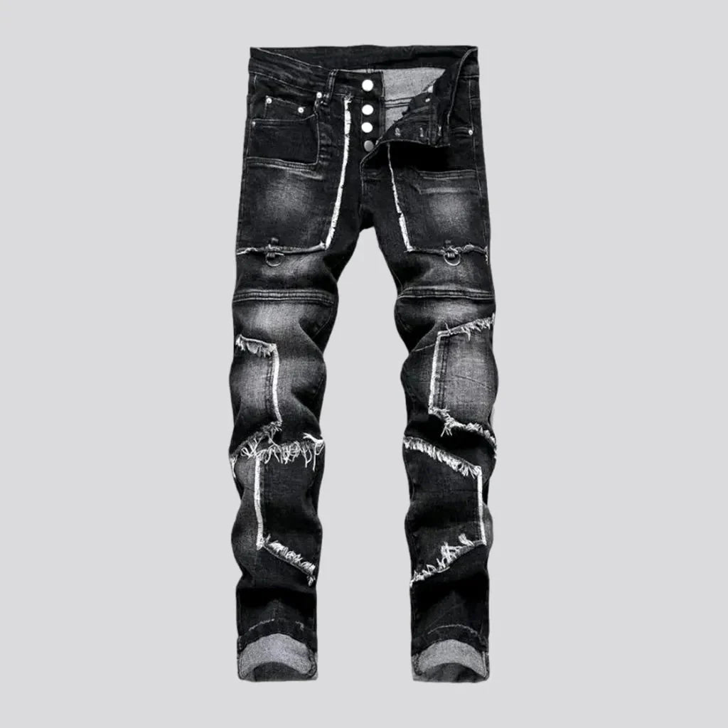 Built for the stylish and confident man. these jeans are a perfect blend of contemporary modern and street style. The intricate patch work and smoothed finish add character and charm to your look. while the mid-waisted cut and button closure ensure a carefree and secure fit.