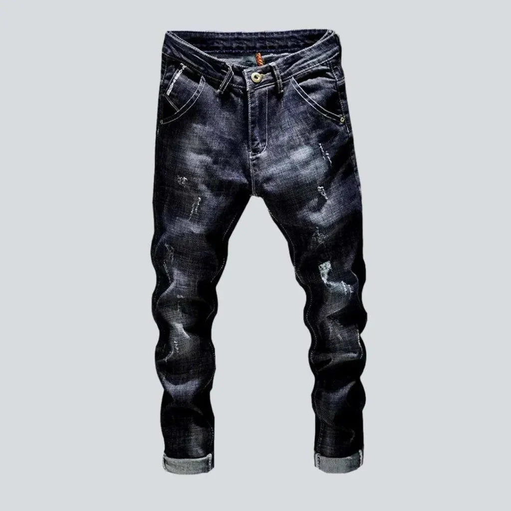 Introducing our Autumn Collection street style dark wash ripped men's jeans. designed to add an edgy touch to your wardrobe. Crafted with superior quality. these mid-waist jeans feature a combination of riveted details. zipper and button closure. and a stretchy fit for maximum comfort and style.