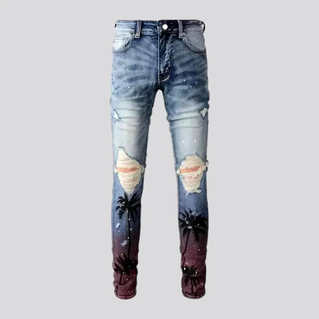 Crafted with a bold and edgy aesthetic. these distressed jeans boast a unique mix of grunge and contemporary style. With a mid-rise cut and striking palms-print design. these jeans will make a statement wherever you go.