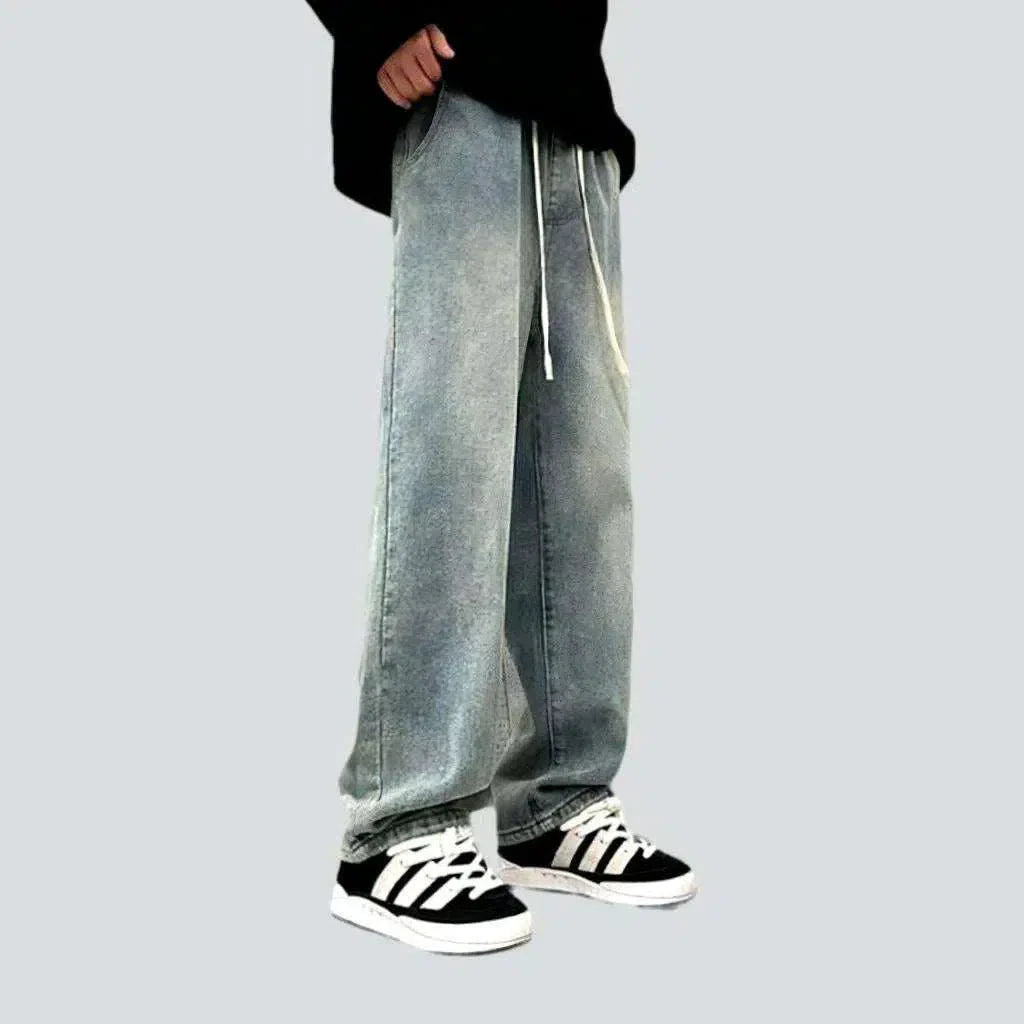 Bring out the best of the couture-vintage combination with these hip-hop inspired denim pants. With their high-waisted. sanded and stonewashed design and drawstrings closure. you can look your best and feel casual all day elongated.