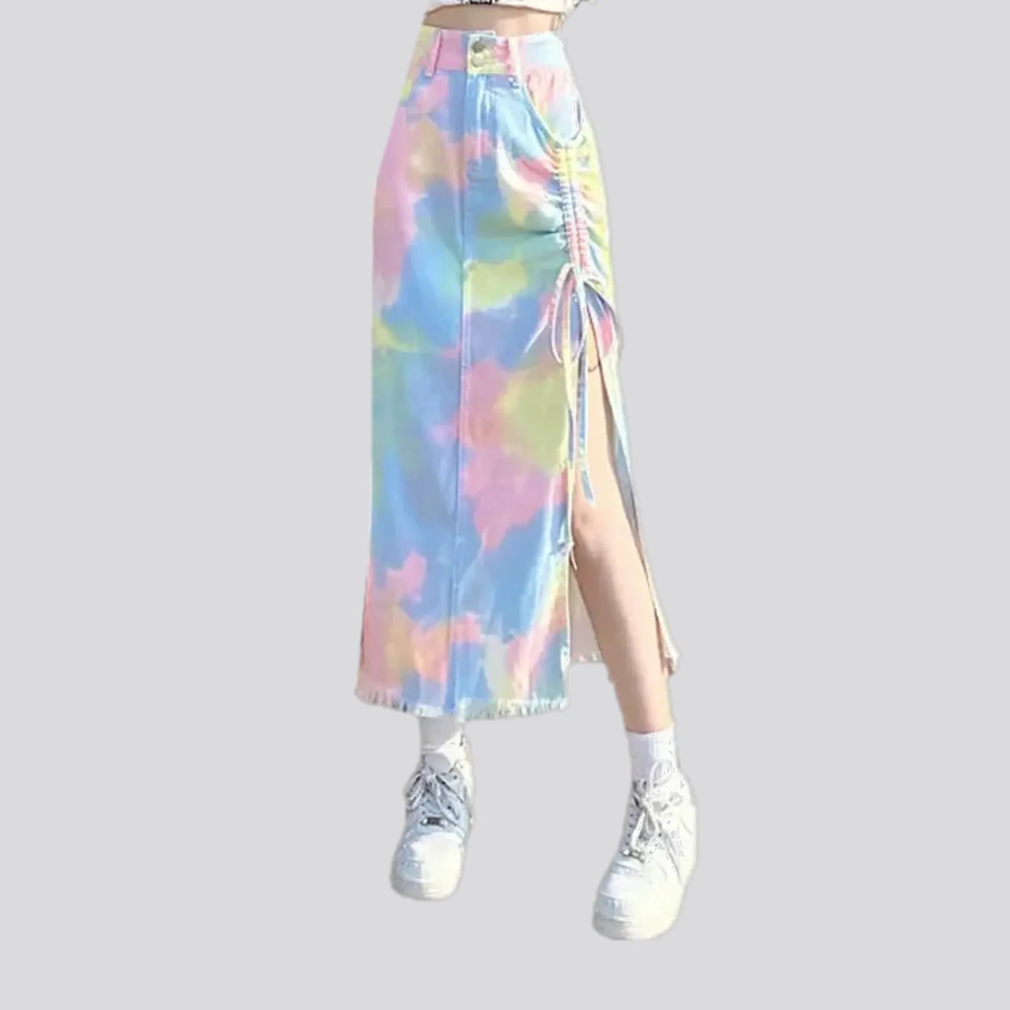 Introducing our stunning multicolor denim skirt. perfect for embracing the spring and summer vibes! This high-waisted maxi skirt combines fashion and function. making it a versatile addition to your everyday wardrobe.