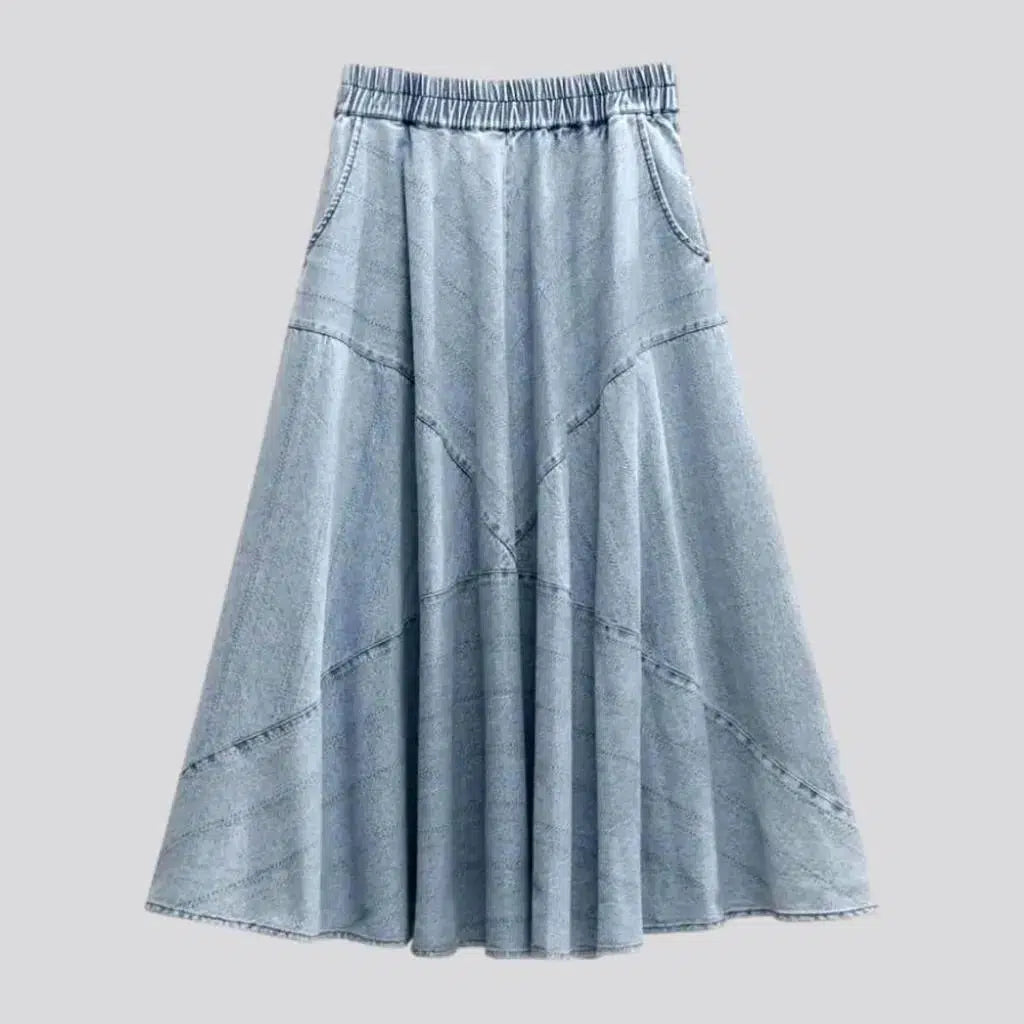 Elevate your urban style game with our retro-inspired silhouette-and-flare jean skirt from the Summer Collection. This light-wash skirt features a unique patchwork design that adds a touch of whimsy to your wardrobe. The high-waist cut is flattering and on-trend. while the rubber closure adds a modern twist. Why This Skirt is a Must-Have