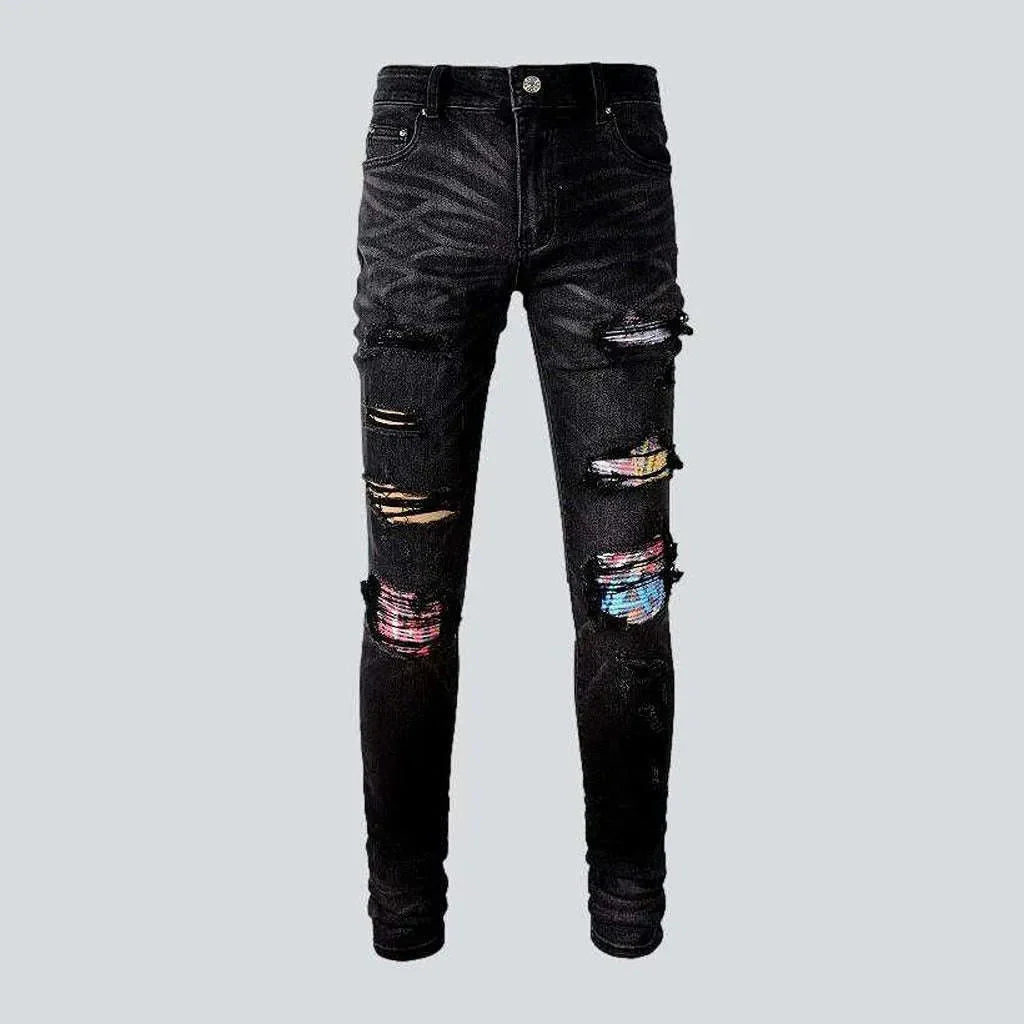 Showcase your daring style with this graffiti print patchwork biker jeans. a daring blend of classic biker style and modern edginess. Perfect for rooftop gatherings. sunlit picnics. or that special evening out - these jeans promise every head will turn when you make your entrance!