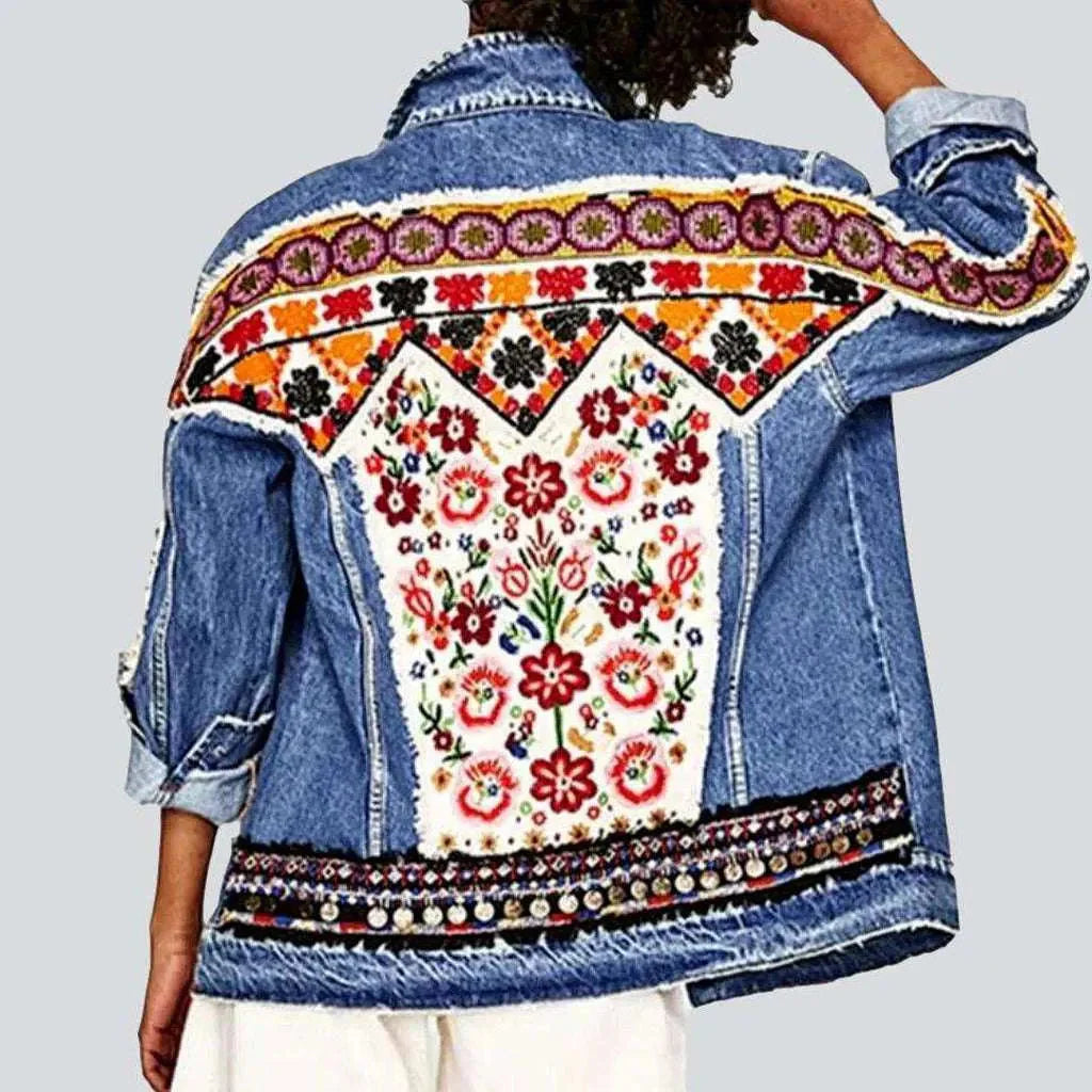 This oversized denim jacket is textured to arouse a sense of freedom and adventure with its captivating patchwork and vibrant color palette. The buttoned closure adds a touch of sophistication. while the patched embroidery and large front pockets make it the ideal statement piece.