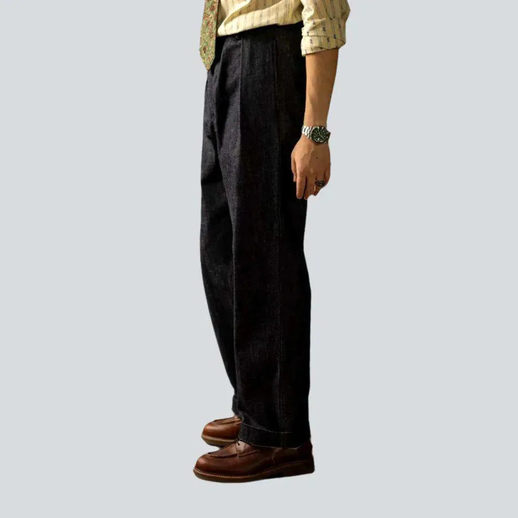 Elevate your street trend with our heavyweight men's 12oz jeans from the Autumn Collection. These raw. straight form jeans are crafted from unsanforized denim. creating a unique and authentic look. The pleated waistline adds a touch of sophistication. while the back cinch allows for a customizable cut. These jeans are designed for the fashionable man who wants to stand out from the crowd.