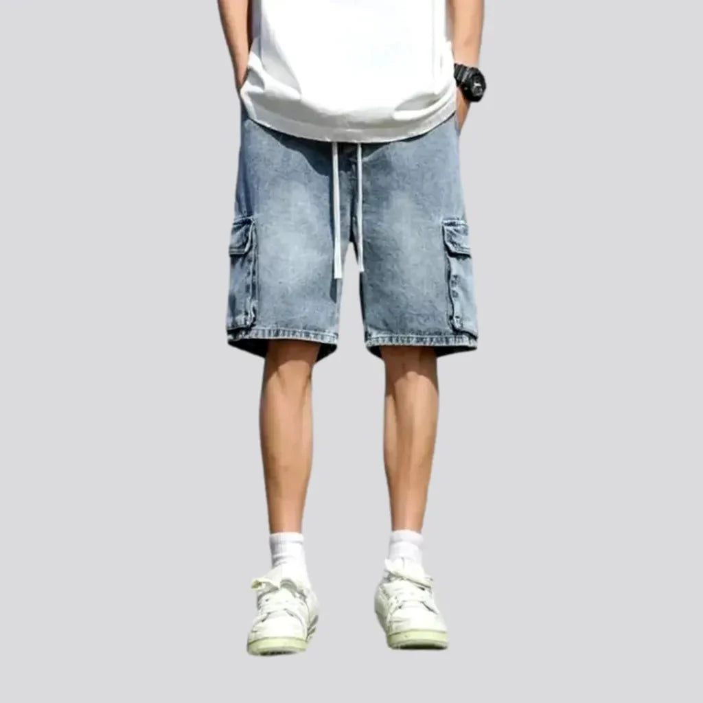 Introducing the must-have trendy item from our Summer Collection elevated-waist men's jean shorts! These shorts are the epitome of style. featuring a baggy fit with a vintage. rock-washed and polished finish. With a knee-length cut. these shorts are not only on-vibe but also non-formal and versatile.