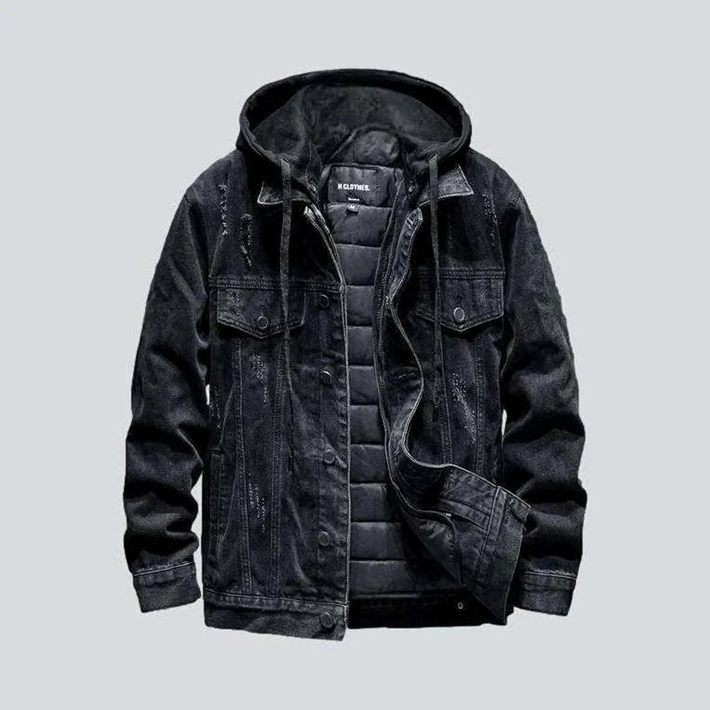 Welcome to Autumn-Winter Collection's street vibe for men a black. thick. hooded. ripped. and buttoned jacket. Crafted with trendy flair. this jacket will be sure to make a bold statement.