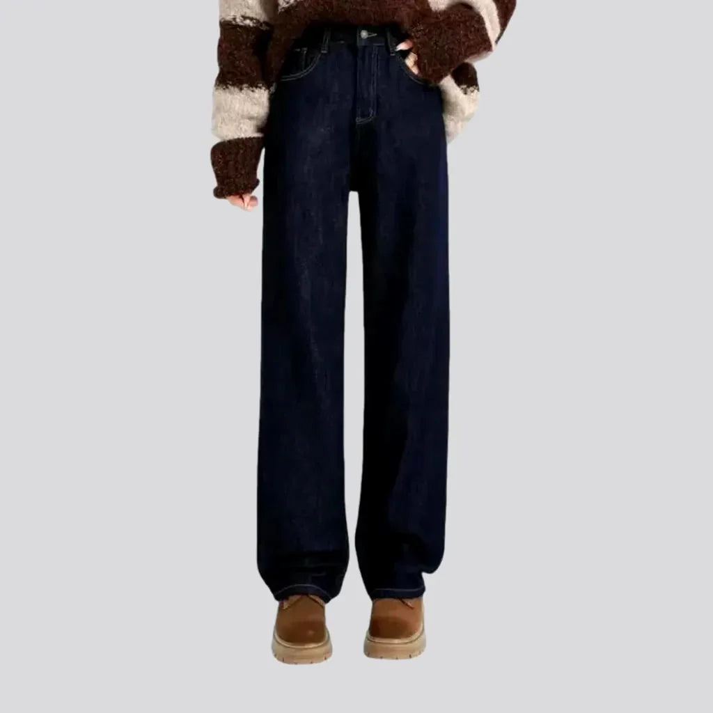 Introducing our stunning high-rise ladies' jeans. perfect for the fall and winter seasons. designed to elevate your street fashion game with a chic 90s vibe. Crafted from a premium blend of cotton. denim. and polyester. these elongated jeans feature a luxurious insulated fabric that keeps you warm while ensuring breathability and comfort. With a classic dark pattern and straight-cut fit. these jeans are not just a wardrobe staple but a statement piece that flatters all body types. The convenient zipped closure adds a modern touch to this timeless style. making them easy to wear while providing a flattering silhouette that you will love. Whether you're dressing up for a night out or keeping it casual during the day. these jeans are versatile enough to pair with any top and footwear. Experience fashion that doesn't compromise on comfort.