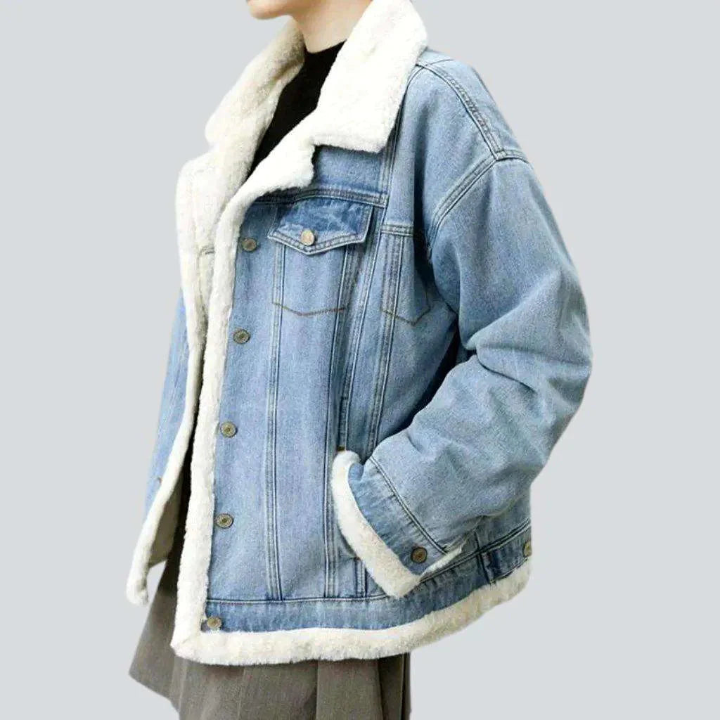 Our Winter Collection brings you the ultimate in '90s-inspired fashion with this Lamb Fleece Women's Denim Jacket. A timeless classic patterned to make a statement. this light wash. oversized. buttoned closure jacket is a must-have for the fashion-forward trend queen.