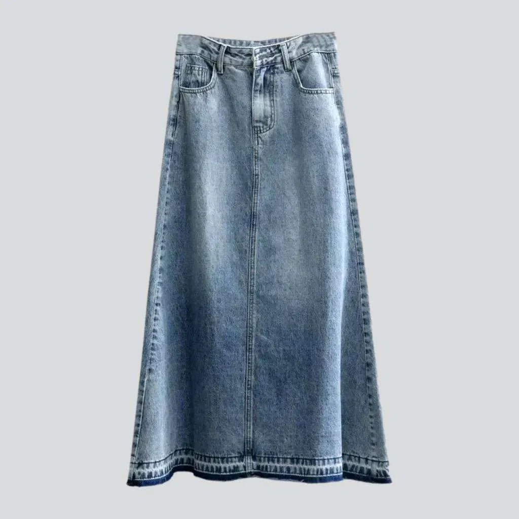 Get ready for summer in the Spring-Summer Collection with our light wash aged jean skirt! This timeless piece boasts a high-waisted design with raw hem and zipper & button closure. perfect for making a statement while staying comfortable and stylish.