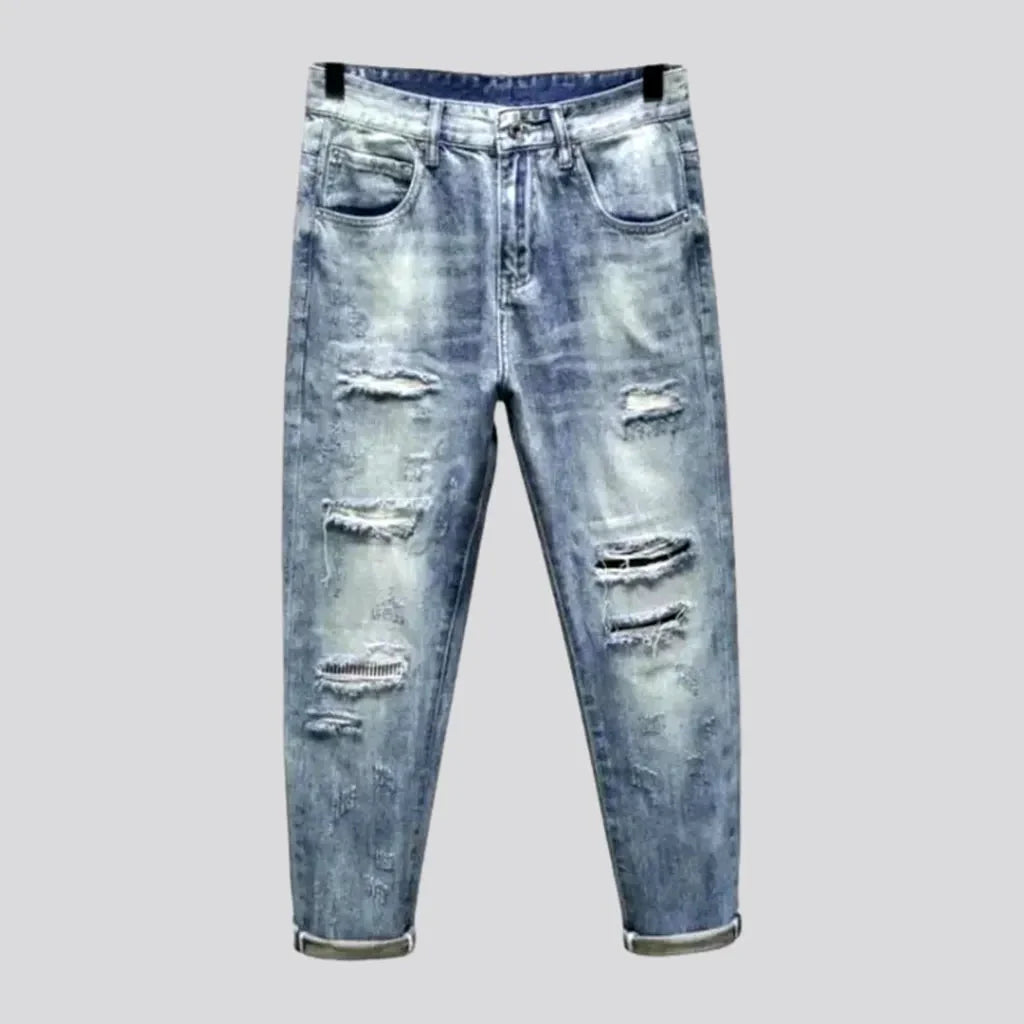 Elevate your flair game with our mid-rise men's free jeans from the Summer Collection. Embrace the punk trend with these frayed light-wash jeans. perfect for making a statement and standing out from the crowd.