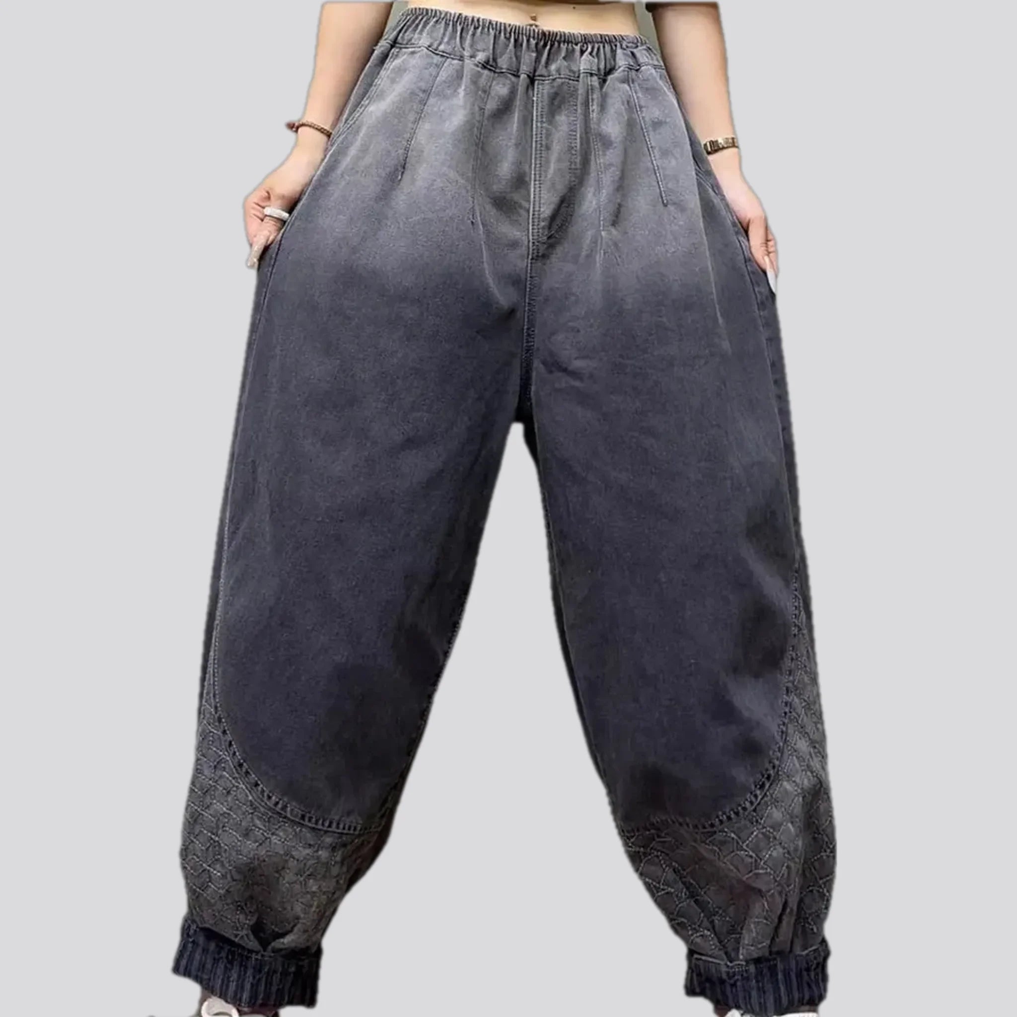 Introducing our ladies' denim joggers. the perfect blend of style and comfort for the fall and winter seasons! Designed with a unique contrast ombre pattern. these joggers embody a boho vibe that's perfect for street fashion. Crafted from premium cotton denim. they feature a mid-rise waist and a delightful baggy fit. ensuring you move freely while looking effortlessly chic. The ankle-length design pairs beautifully with your favorite boots or sneakers. while the elasticated waistband and rubber hem provide a snug yet comfortable fit that flatters every silhouette.