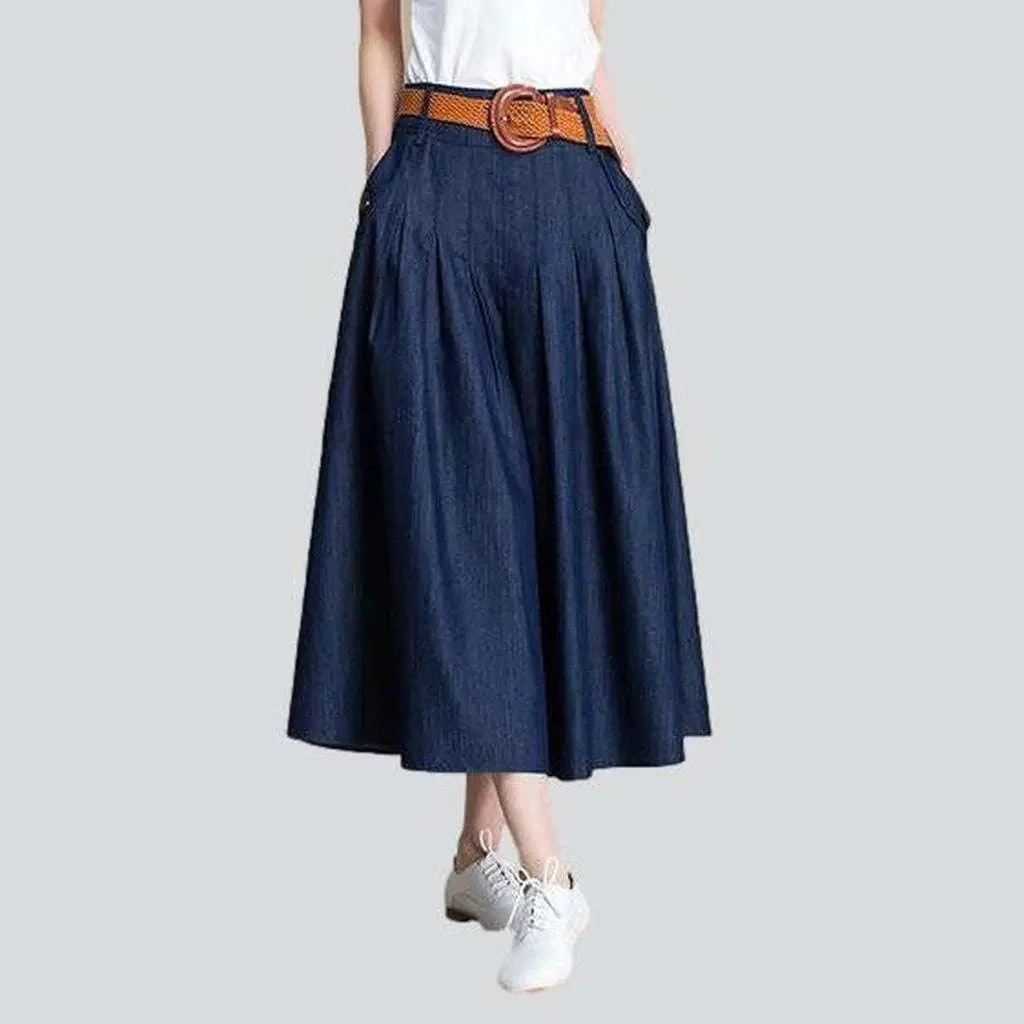 Introducing our Navy Flare Long Denim Skirt from the Spring-Summer Collection! Perfect for the modern fashionista who seeks to stand out in the crowd. this skirt features a unique blend of urbane style with a high-waisted. cut-and-flare shape and dark wash. Its rubber closure and special detailing make it an absolute must-have!