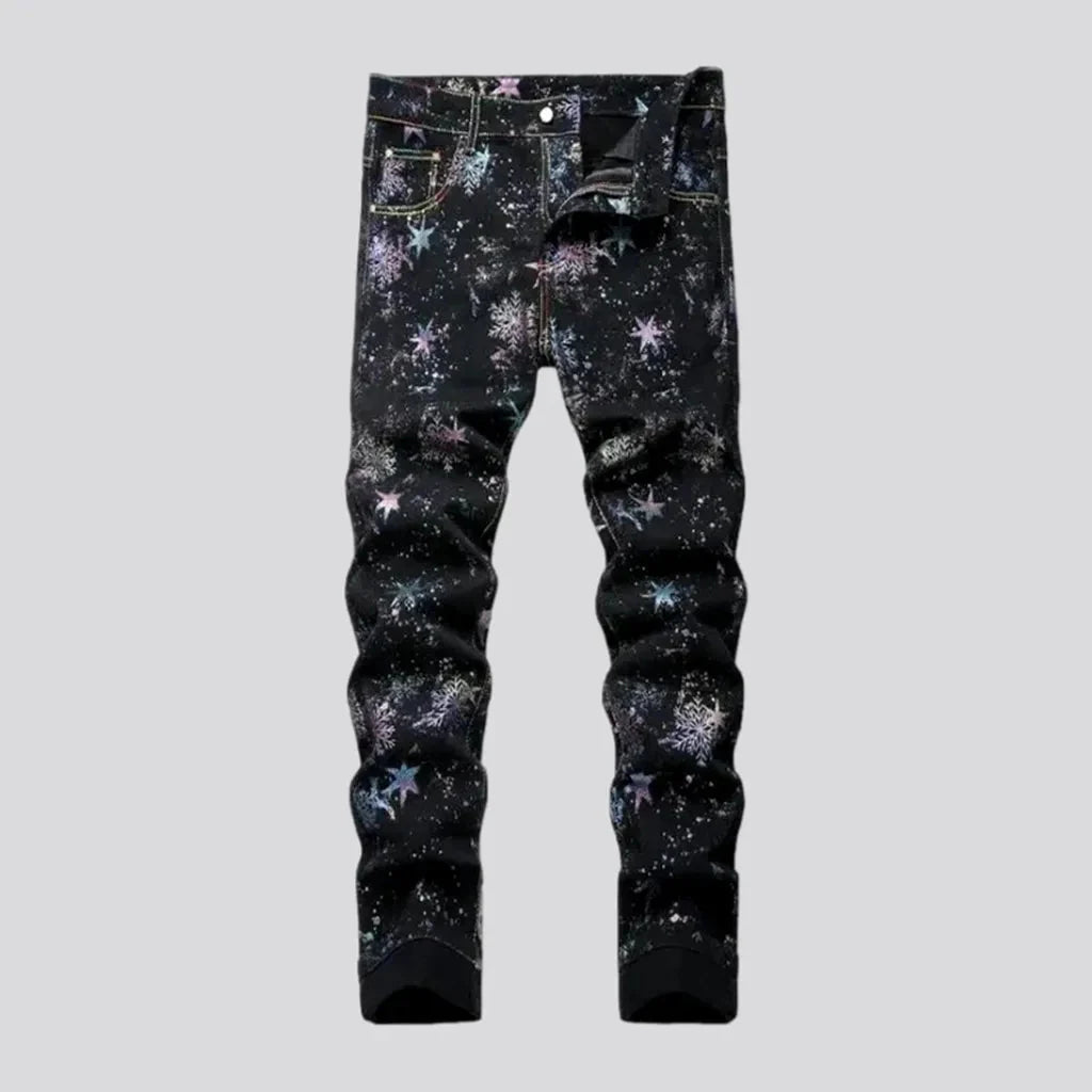 These skinny jeans are a perfect blend of retro and couture styles. featuring a unique painted color stars print that will make you stand out in any crowd. The mid-rise design offers a flattering fit. and the zipper and button closure add a touch of sophistication.