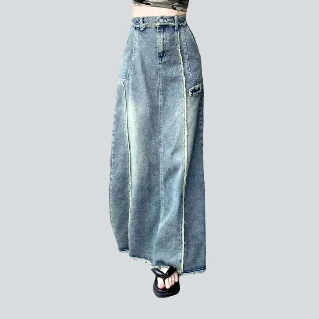 Introducing the Spring-Summer Collection's raw hem tall-rise denim skirt for ladies; a vintage-inspired. floor-length masterpiece crafted for the couture-forward. With its unique raw hem. elevated-rise waistline. and zipper & button closure. it's perfect for making a statement no matter the occasion.