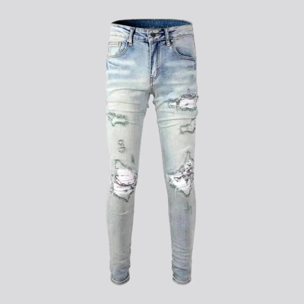 Don't miss out on these skinny rock-n-roll jeans from our Summer Collection. Embrace the alternative style and stand out with these distressed. light-wash jeans featuring unique white-patches and whiskered accents. Perfect for any occasion. these jeans are a must-have for any style connoisseur. Elevate your style and make a statement with these iconic jeans don't let them slip away!