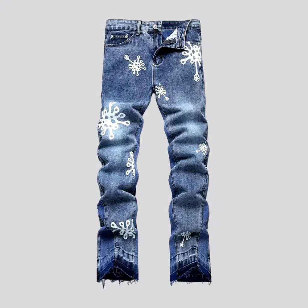 Introducing the epitome of boho style for the modern man our skinny unrefined-hem jeans from the Spring Collection. These painted jeans feature a medium-wash. mid-waist fit type with a zipper and button closure for a sleek and stylish look. Embrace your individuality with the edgy raw hem. adding a vintage touch to your wardrobe. These jeans are perfect for the skinny man who loves fashion as an art.