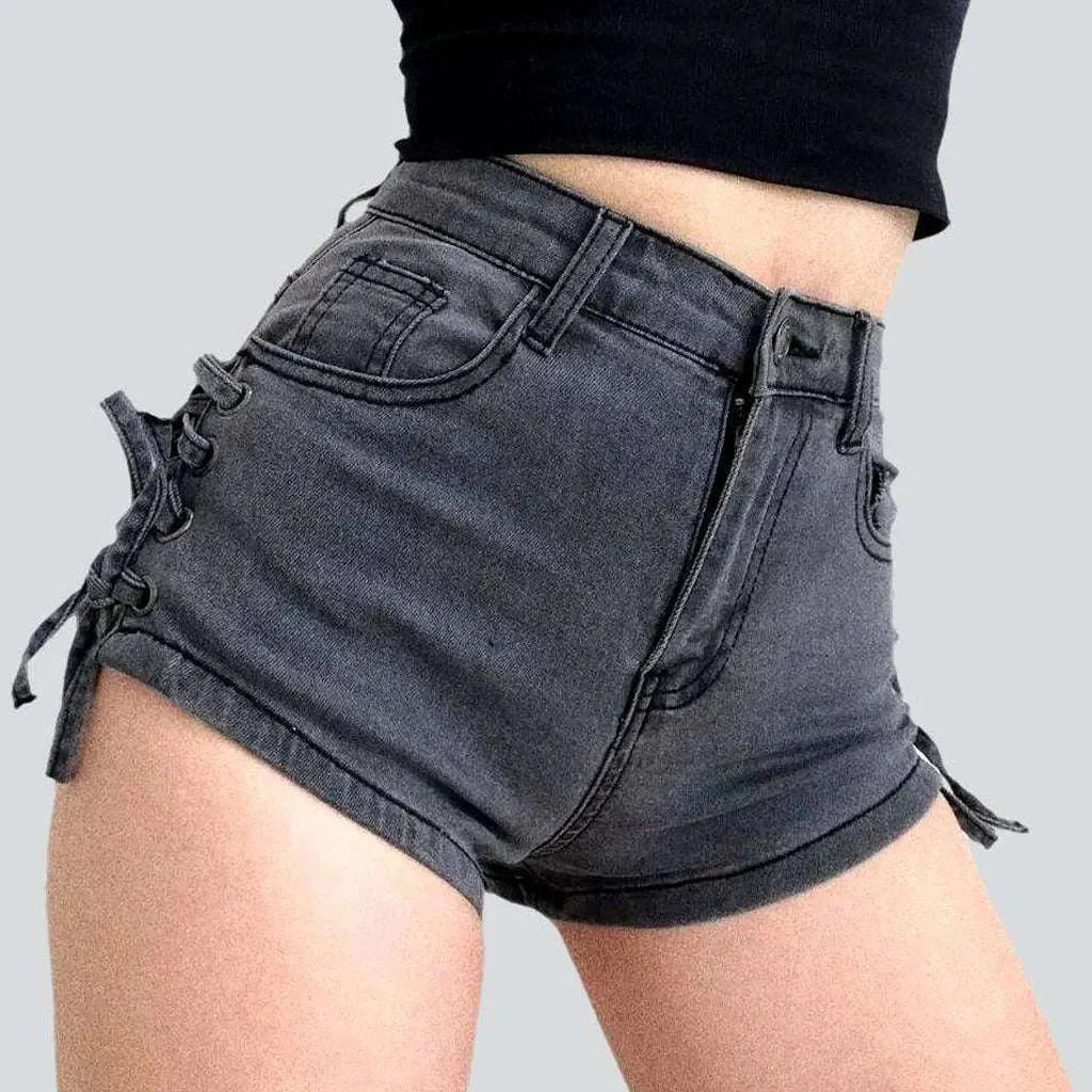 Make a vibe statement with our Summer Collection of skinny shorts with side drawstrings. These mid-waist. rock-washed shorts boast trendy features like a zipper and button closure. making them the perfect combination of conventional and contemporary.