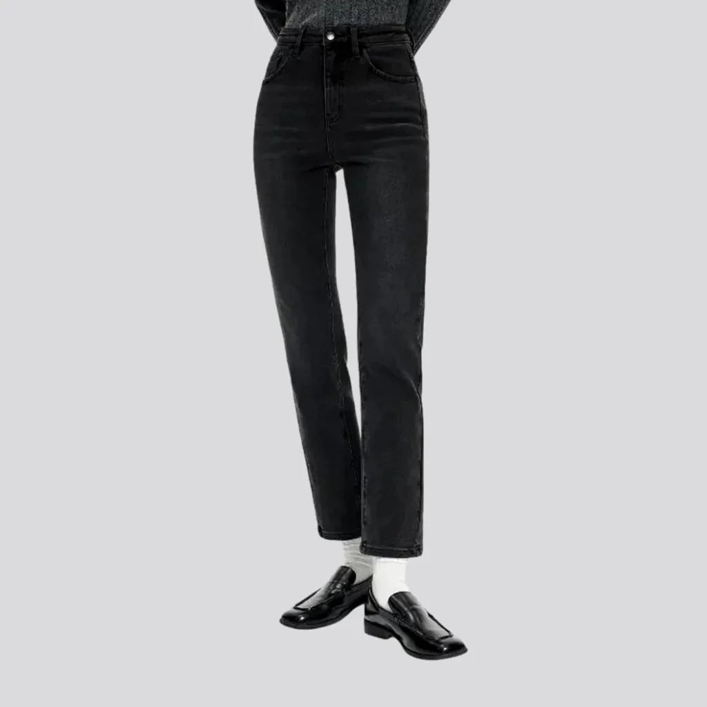 Discover the ultimate blend of style and comfort with our women's high-waisted ankle-length jeans. designed to elevate your fall and winter wardrobe. Crafted from a premium combination of cotton. denim. and polyester. these jeans are both durable and soft to the touch. ensuring all-day comfort as you go about your day. The zip closure provides a secure fit. while the chic monochrome pattern adds a sophisticated edge to your outfits. The fashionable cigarette straight-leg design accentuates your silhouette beautifully. making these jeans perfect for both casual outings and slightly dressier occasions.