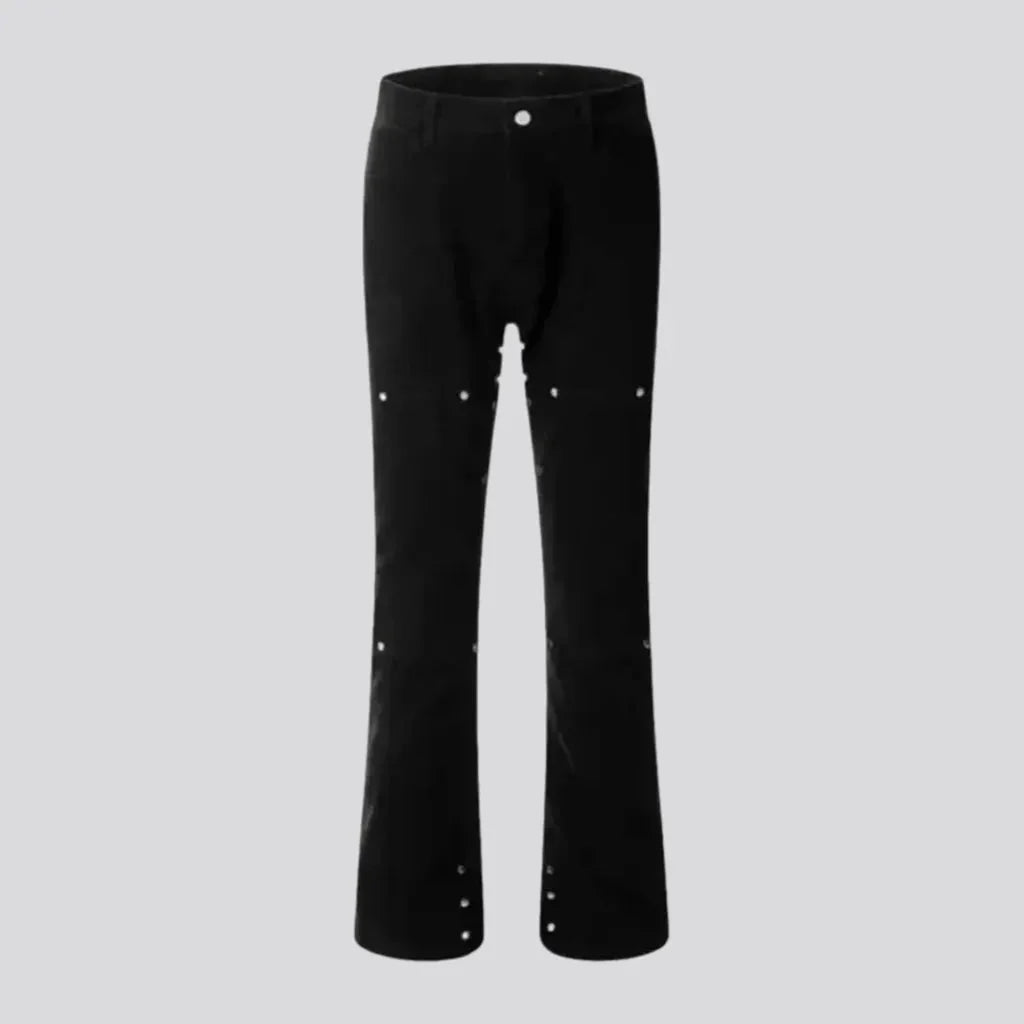 Introducing our men's bootcut-fit jeans. tailored for the modern man who values both style and functionality. Crafted from high-quality denim. these jeans boast a mid-rise waist that offers the perfect balance of comfort and support. ideal for fall fashion. With a long pant length. they're perfect for pairing with your favorite boots or sneakers. The luxurious zipped closure ensures a secure fit. while the embellished design featuring striking metal studs and intricate stitched details elevates these jeans to a new level of fashion-forwardness. Distinctive Features: