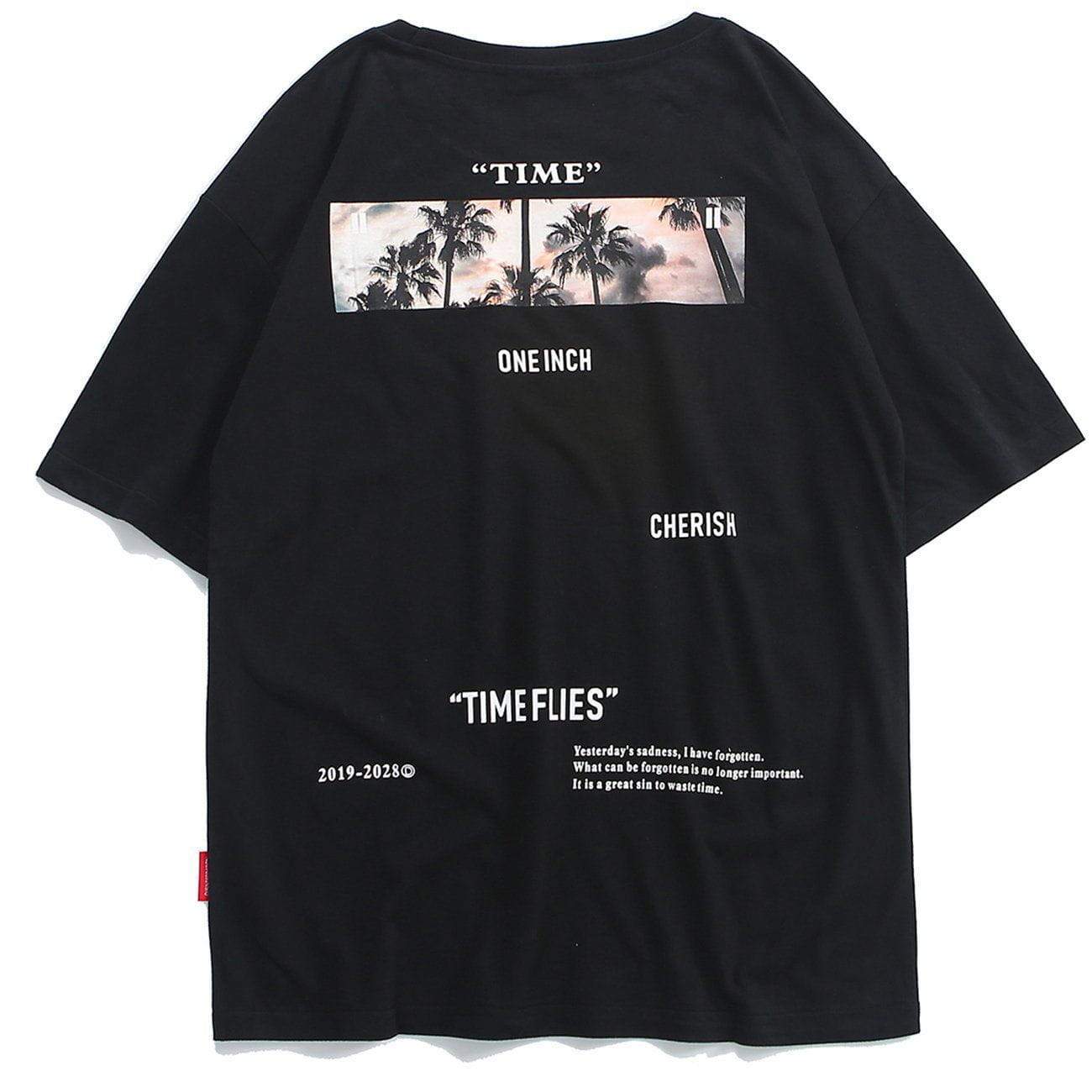 Original designer: Summer new style European and American hip-hop avant-garde abstract short-sleeved T-shirt with time print under the coconut tree.