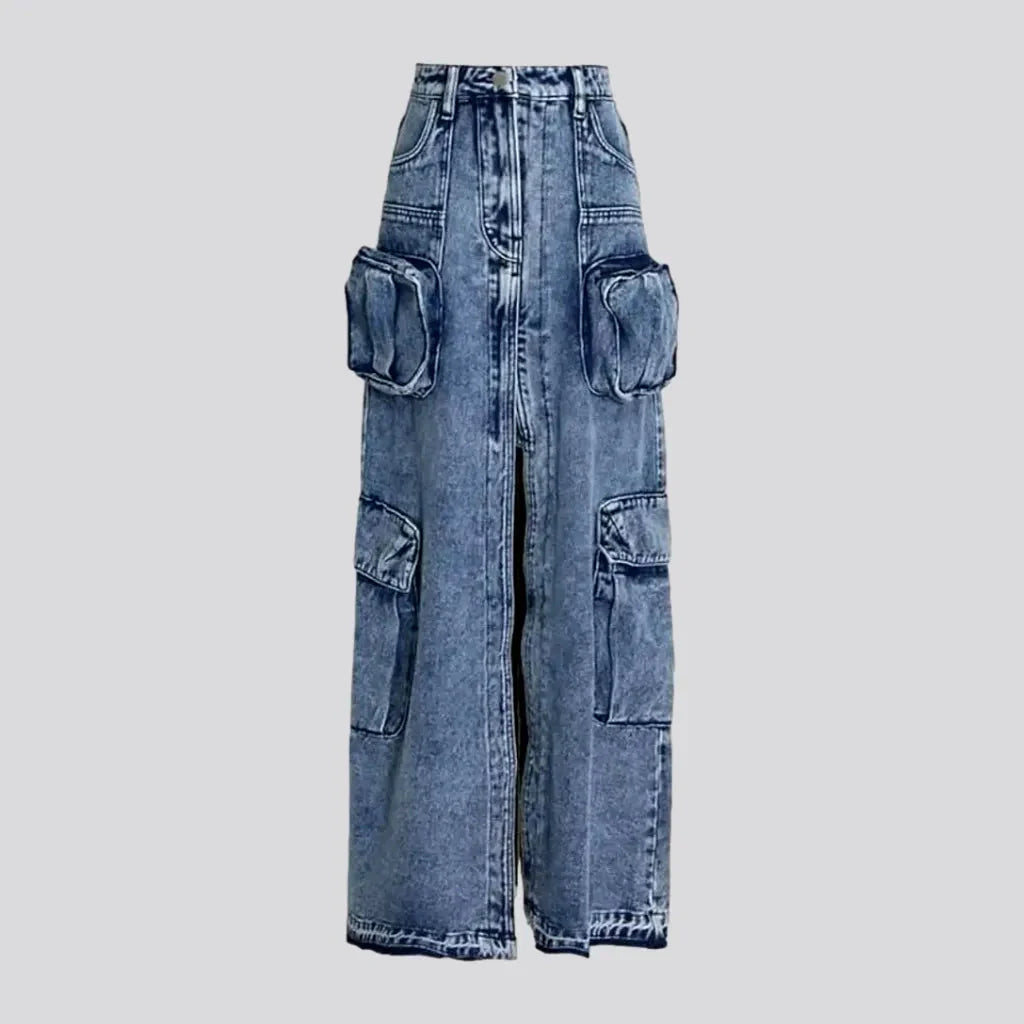 Elevate your couture game with our vintage elongated women's denim skirt from the Spring-Summer Collection. This front-slit skirt exudes a traditional charm. while its balloon silhouette adds a touch of modernity. Featuring a high-waist design and zipper & button closure. this skirt is not only stylish but also casual to wear.
