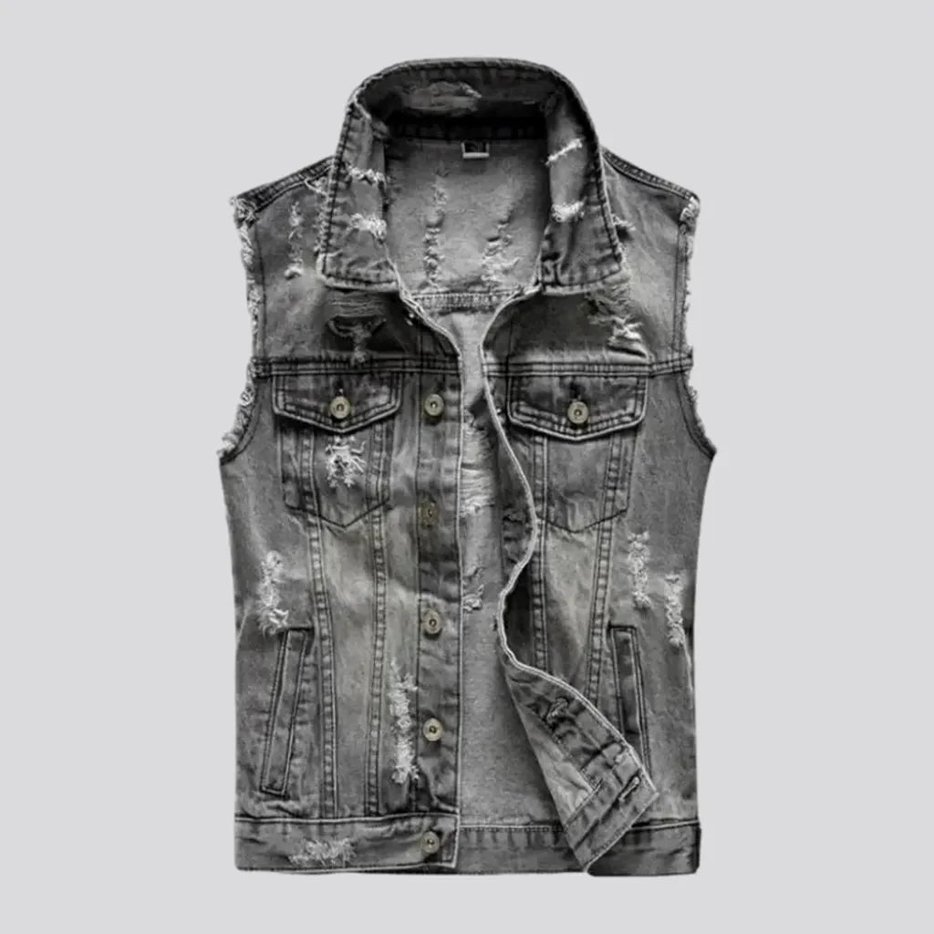 Make a statement and stand out from the crowd with this rough-style denim vest. Perfect for informal outings. music festivals. or even as a layering piece for a formal event. this vest will add a touch of rebelliousness to your outfit.