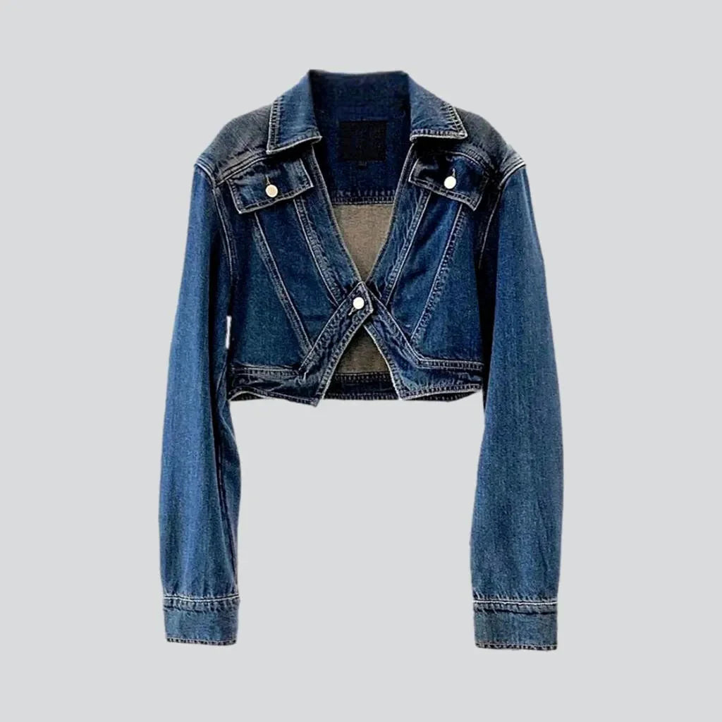 Elevate your urban style this Autumn with our vintage-inspired ladies' v-neck jean jacket! Our Autumn Collection piece features a short. dark wash. oversized fit. long sleeves and a V-neck for a timeless look that exudes effortless sophistication.