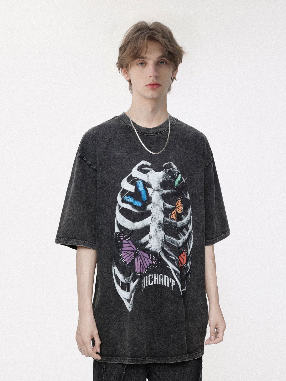 Bone elements have been used in fashion clothing. it's a trend for many youngsters. White bones collide with colorful butterflies. which gives people a feeling of dark wind. And the cotton is soft and comfortable. Vintage washed style is versatile.