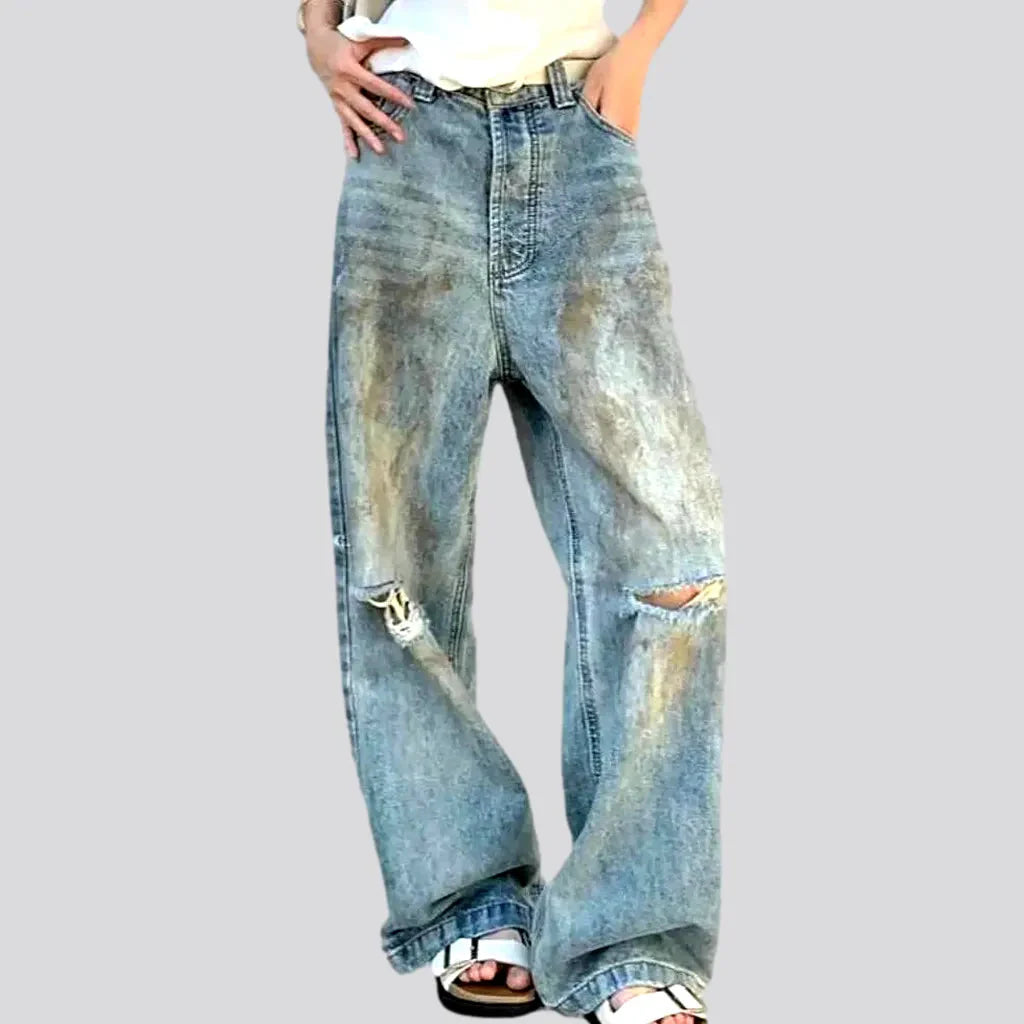 Elevate your summer wardrobe with our Y2K-inspired. baggy furrowed printed jeans for ladies from our Summer Collection. These jeans feature ripped-knees and a unique mud-print design. adding a touch of edginess to your look. The light-wash adds a vintage vibe. while the mid-waist fit and floor-length flair make them versatile for any occasion.