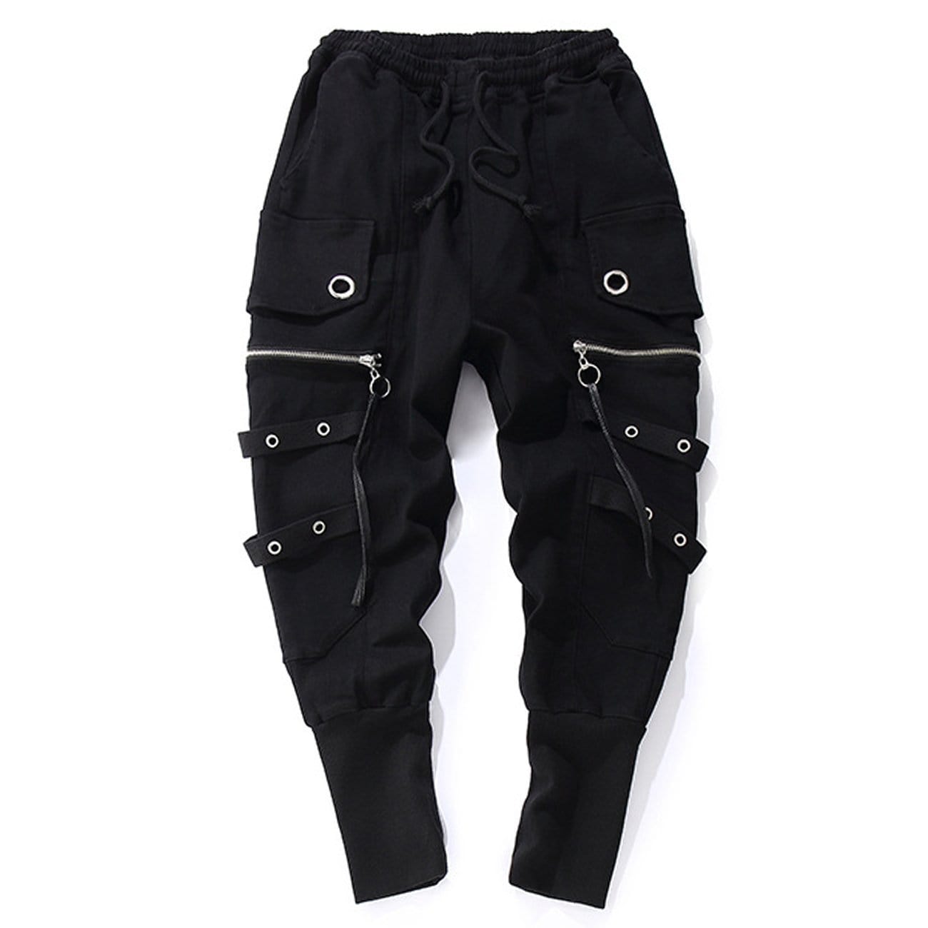 Unusual streetwear style. giving a fellow and comfort notion: the WLS Zippers Multi Pockets Ring Pants. define at best the concept of techwear style. Its outstanding style. consists of rings and zippers such as features. attracting and catching everyone's attention while walking around. Thanks to their elastic cuffs and waistband. the pants fit perfectly to your body. making you also feel free to move without any restrictions.